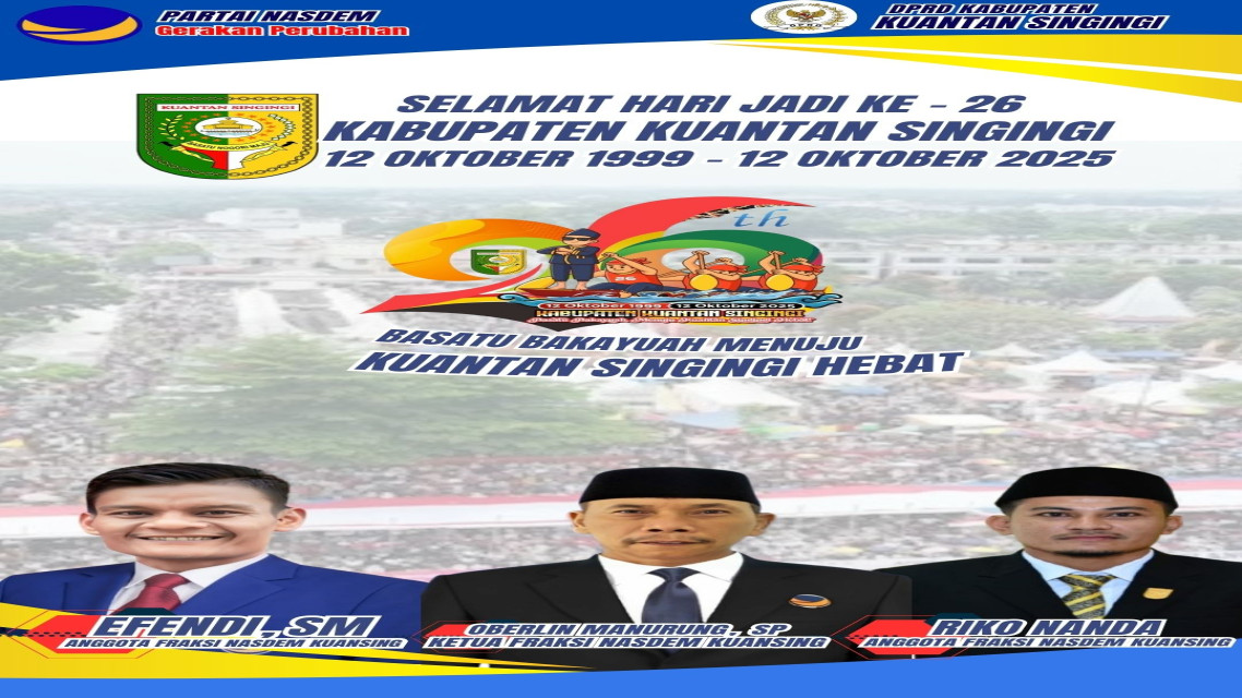 Partai NasDem Kuantan Singingi melalui Ketua Fraksi NasDem DPRD Kuantan Singingi, Oberlin Manurung, SP menyampaikan ucapan selamat HUT ke-26 Kabupaten Kuantan Singingi yang jatuh pada hari Minggu 12 oktober 2025.