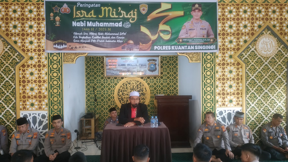 Kapolres Kuantan Singingi AKBP Angga F. Herlambang, S.I.K., S.H., dalam kesempatan ini menegaskan bahwa peringatan Isra Mi’raj tidak hanya menjadi momen refleksi spiritual, tetapi juga sebagai pengingat bagi seluruh anggota kepolisian untuk terus meningkatkan kualitas ibadah dan kinerja dalam menjalankan tugas sebagai pelindung, pengayom, dan pelayan masyarakat,"