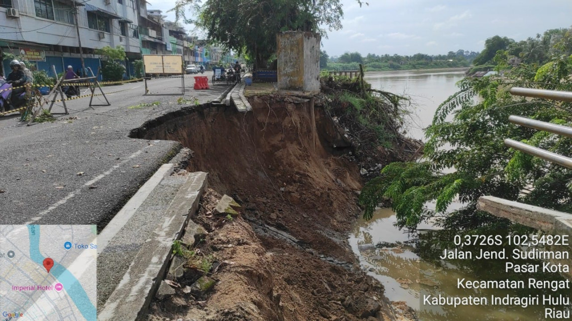 Rengat | INewsfaktual.com – Abrasi Sungai Indragiri kembali mengancam wilayah padat penduduk di Kabupaten Indragiri Hulu (Inhu). Kali ini, turap penahan tebing di Jalan Jendral Sudirman, Kota Rengat, kembali longsor pada Selasa ( 26 Agustus 2025) sekitar pukul 22:00 WIB. Titik longsor tidak jauh dari Jembatan Trio Amanah, sehingga memicu kekhawatiran masyarakat.